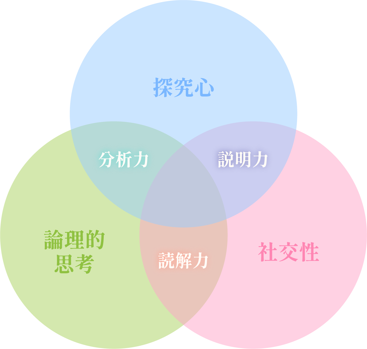 物事を深く知ろうとする探究心。筋道を立てて考える論理的思考。コミュニケーションにおいて、相手を意識する社交性。